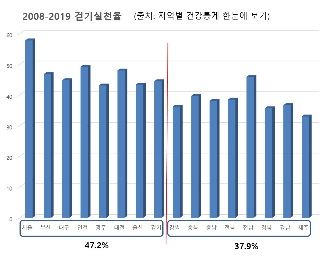지하철과 전철이 운행되는 지역과 그렇지 않은 지역간의 걷기실천율을 비교했다.