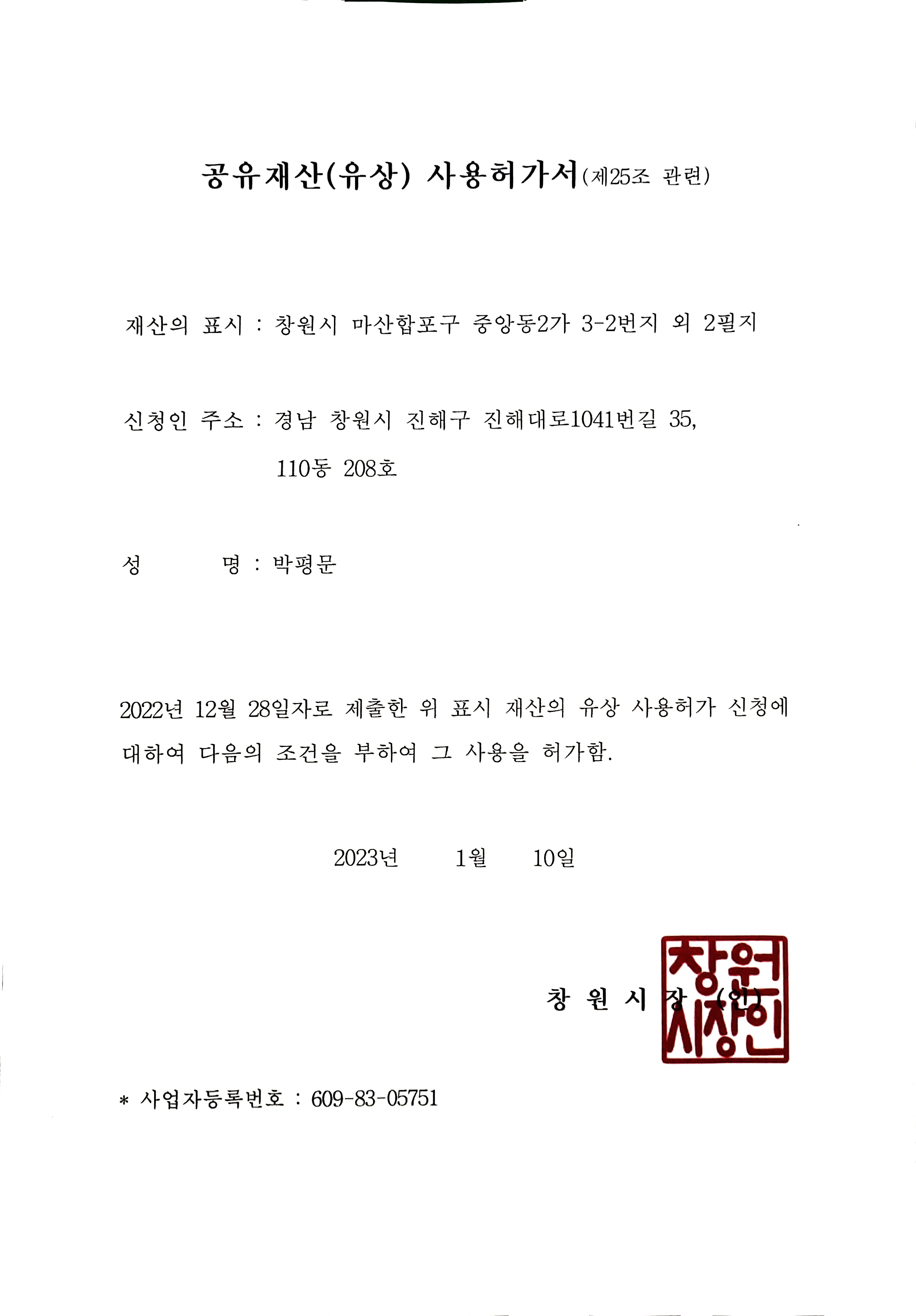 '공유재산 사용허가서'다. ㅎㅎ