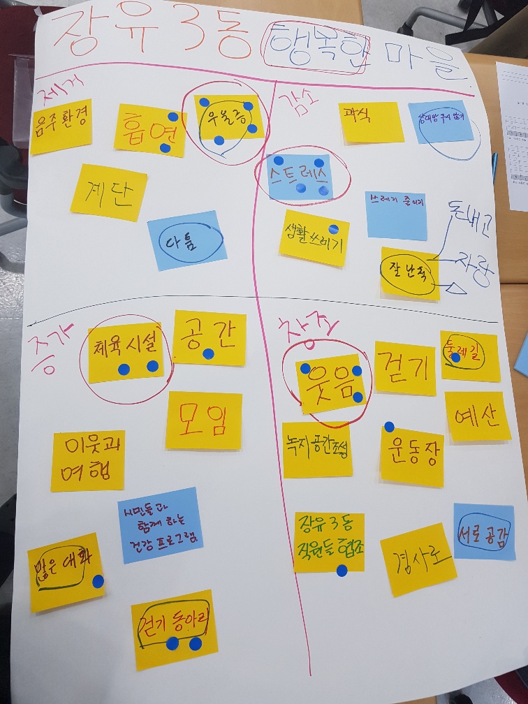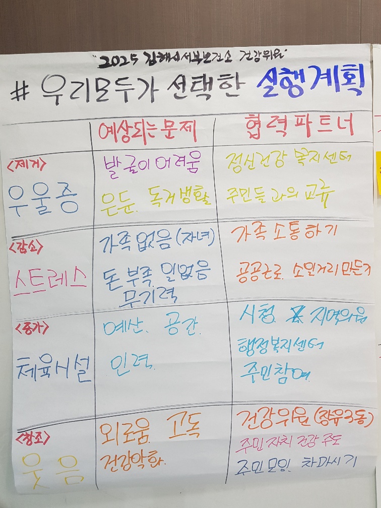 우리 마을의 건강문제를 객관적 건강지표를 통해서 확인하고 개선을 위해서 누구랑 무엇을 하면 좋을지 머리를 맞대었습니다.